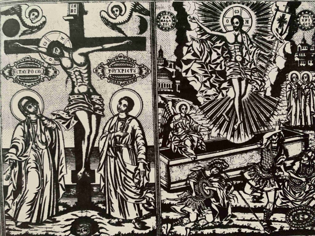 A Crucificação e a Ressureição de Cristo – Monge Kyrillos do Monte Athos – Museu Samokov, Bulgária – Paper Icons – 1851