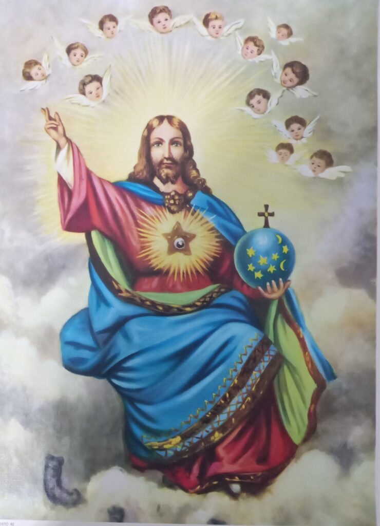 Essa pintura representa Cristo Rei em um estilo devocional e simbólico, característico da arte católica contemporânea.