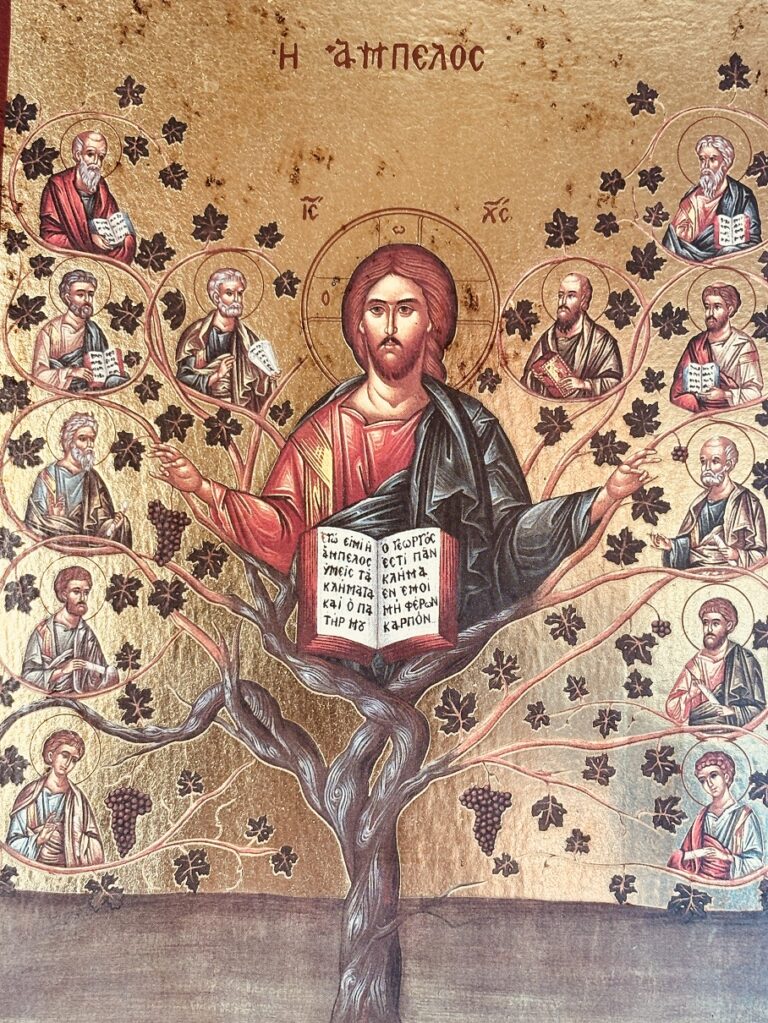 Em uma delas, Cristo na imagem de Pantocrator é cercado por uma videira, em cujos ramos estão representados os apóstolos e, às vezes, a Mãe de Deus e João Batista.