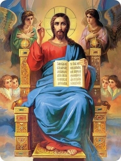 A imagem apresenta Cristo entronizado em majestade, cercado por anjos, em um ambiente celestial.