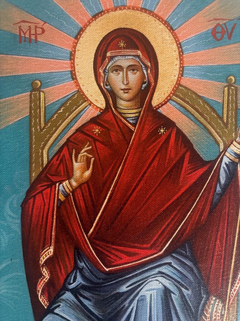 Sua postura é solene, repleta de serenidade e autoridade espiritual, revelando não apenas uma figura materna, mas também a Theotokos — a “Portadora de Deus”, título central da devoção ortodoxa.