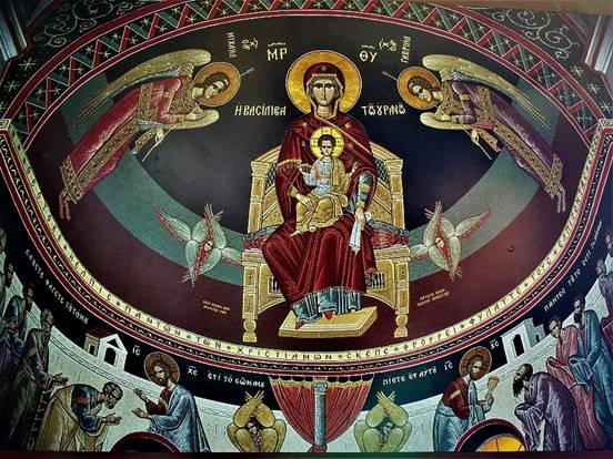 Nossa Senhora Rainha dos Céus – (Platytera entronada e o menino Jesus) – Cúpula – Monge Mikael – Monastério Stavronikita – Monte Athos