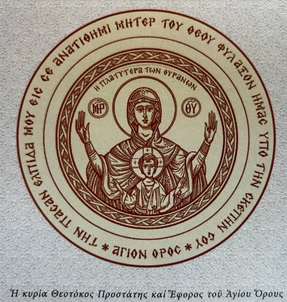 O ícone da Panagia Platytera é bastante conhecido no Monte Athos por seu símbolo do selo postal da Montanha Sagrada e derivou do ícone Oranta (Panagia da Poderosa Oração ou Virgem orando com as mãos para cima).
