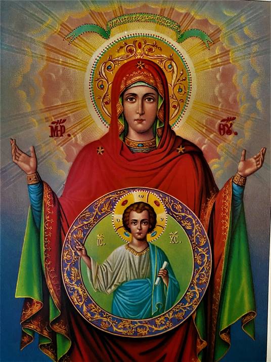 Platytera ou Platitera também é conhecida como Nossa Senhora do Sinal que ora e olha para a frente, indicando a santidade da Virgem Maria e o caminho da Salvação que é o seu filho divino e que está em seu colo entronado.