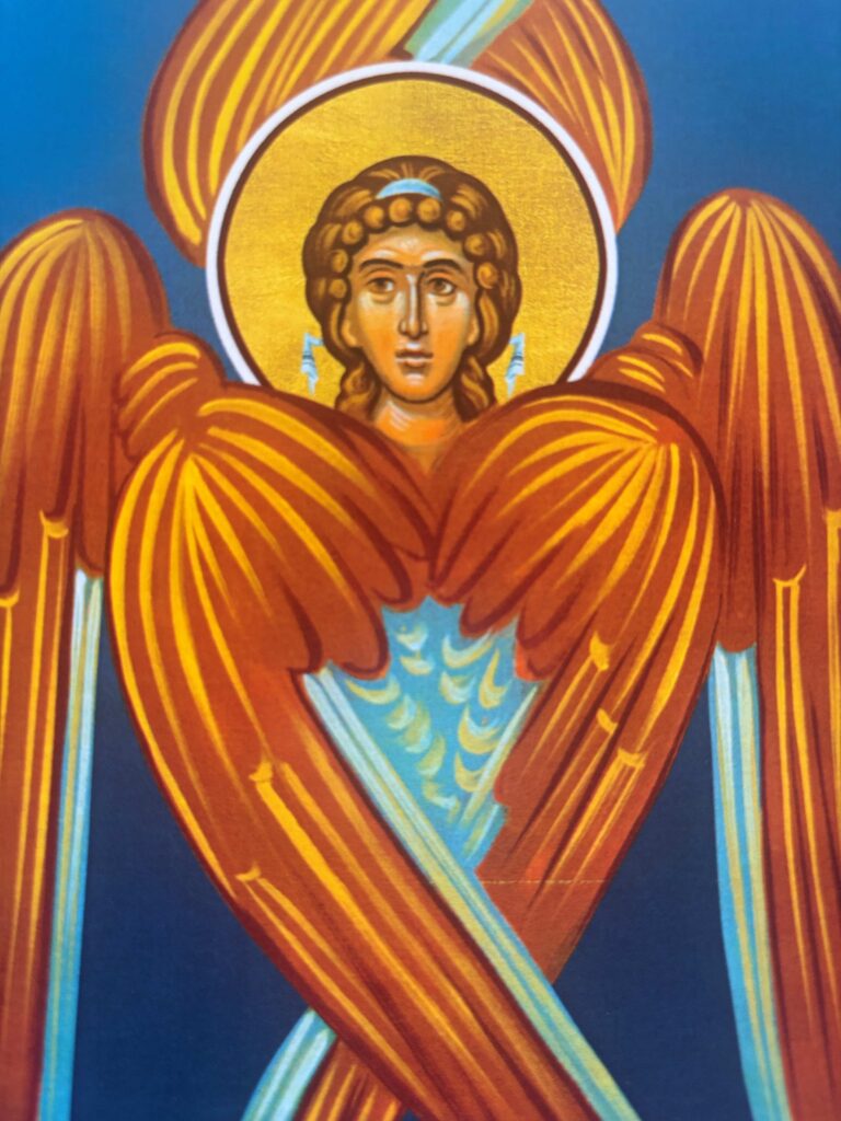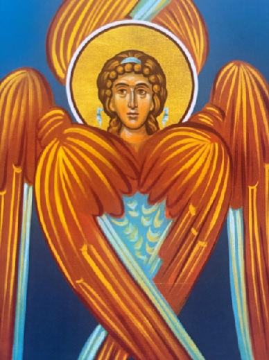 No ícone, essas asas estão entrelaçadas num movimento harmonioso que cria uma sensação de constante dinamismo espiritual, como se o Serafim estivesse envolto em chamas vivas que se elevam em direção ao Criador.