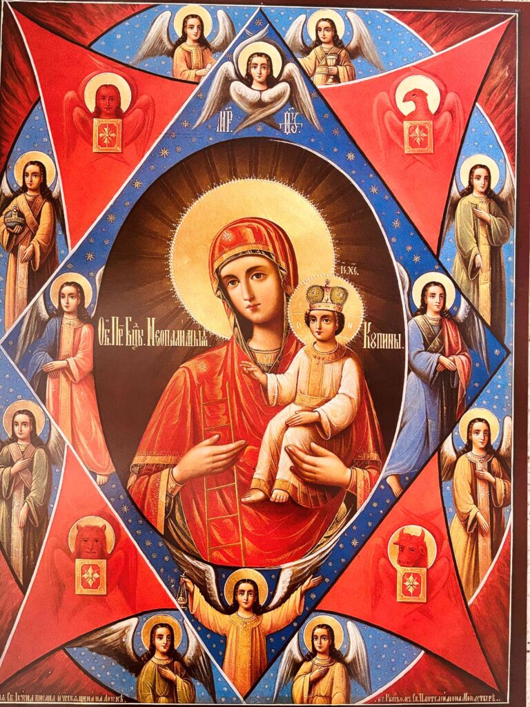 A representação central da Mãe de Deus também possui conteúdo profético: são visíveis os símbolos da escada (que após a encarnação reúne céu e terra), da pedra (a profecia de Daniel) e a representação de Cristo, grande sacerdote, que celebra a eucaristia no altar do seu sepulcro, Jerusalém.