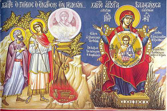 A Sarça Ardente prefigura a Mãe de Deus porque o Senhor, tal como a Sarça, veio habitar no Seu seio sem a “consumir”, isto é, sem alterar a sua virgindade.