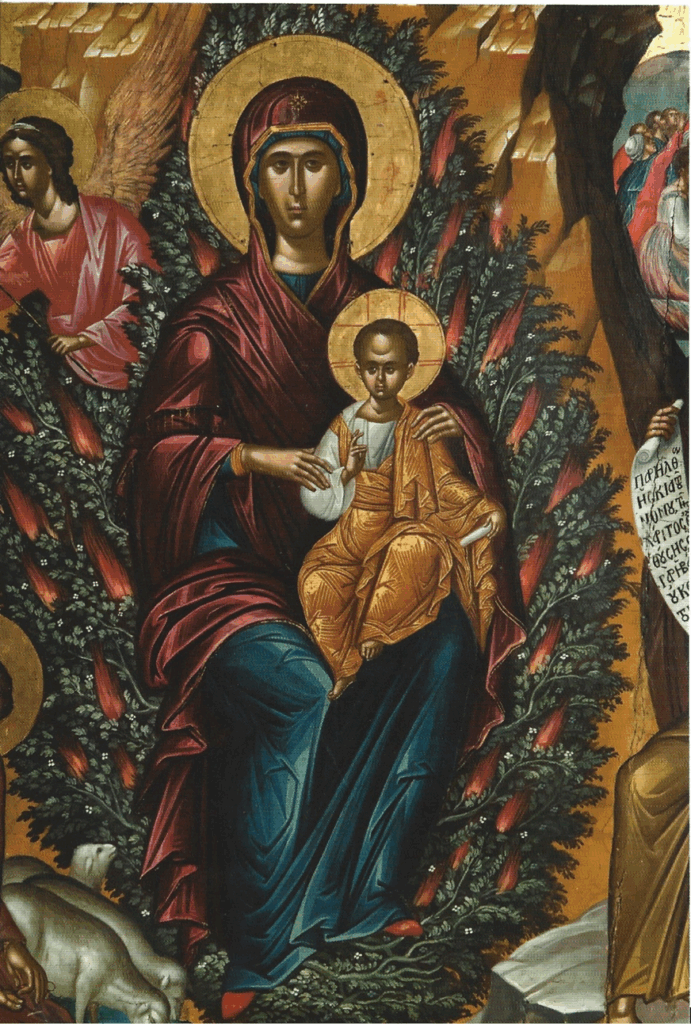 In the center of the image, the Virgin and Child appear enthroned within the Burning Bush (Θεοτόκος ή Βάτις).